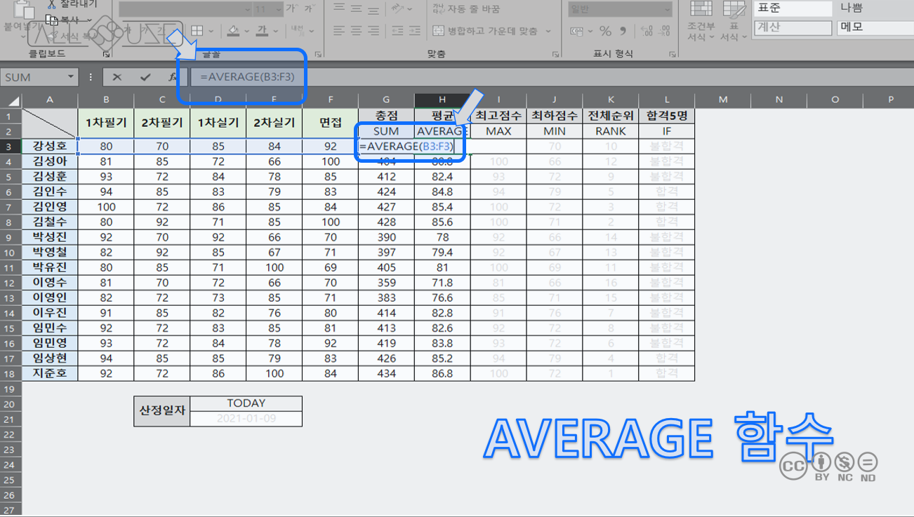 1번 응시자의 1차 필기점수부터 면접점수 까지 얻은 모든 점수의 평균값을 AVERAGE 함수로 구할거에요.