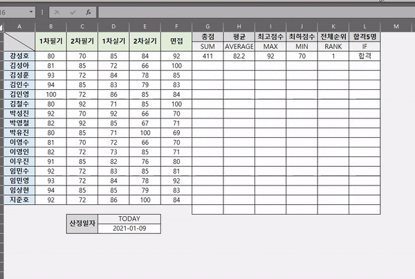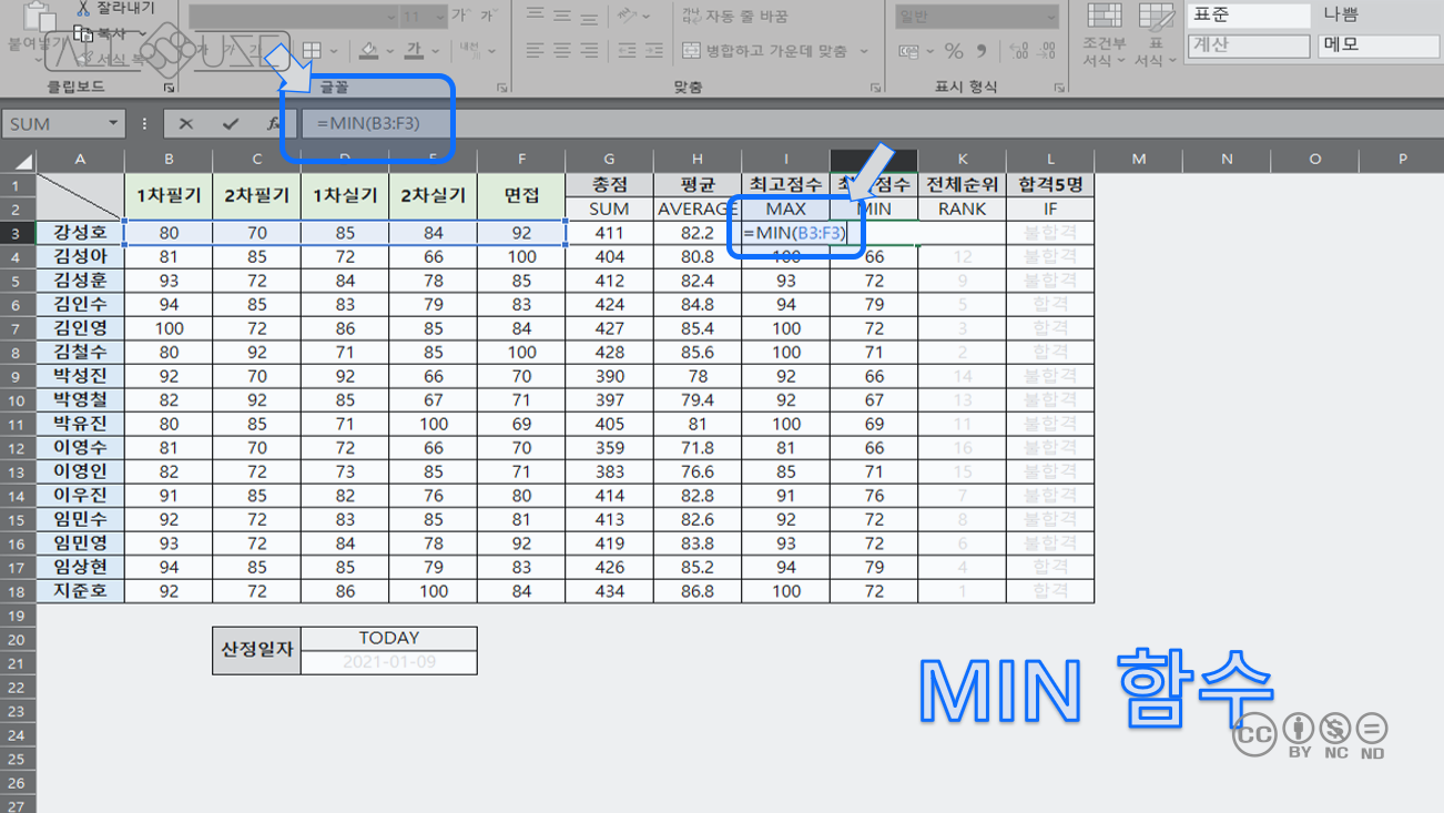 1번 응시자의 1차 필기점수 부터 면접점수까지 모든 점수 중에서 제일 낮은 점수를 MIN 함수로 찾아볼거에요.