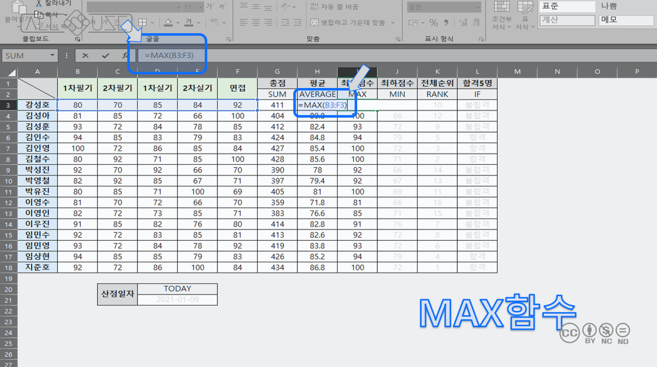 1번 응시자의 1차 필기점수 부터 면접점수까지 모든 점수 중에서 최고높은 점수를 MAX 함수로 찾아볼거에요.
