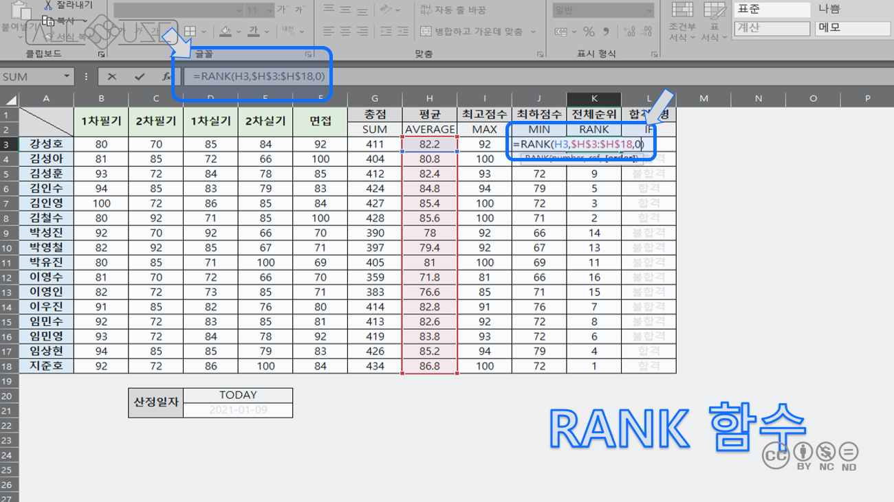 = RANK( 대상이 되는 점수 , 점수(평균점수)의 전체 대상 범위 , 내림차순일경우 : 0 / 오름 차순 일경우 : 1 )