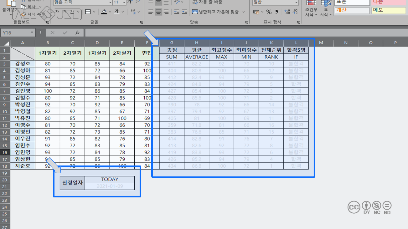 하나. 각 셀 점수의 합을 구하는 더하기 SUM 함수