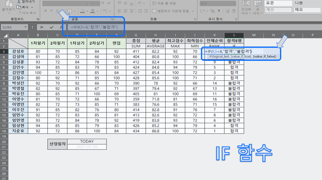 = IF (K3의 값이 6보다 작을경우 , 작은게 맞으면 "합격"표시 ,작은게 아니라면 "불합격" 표시 )