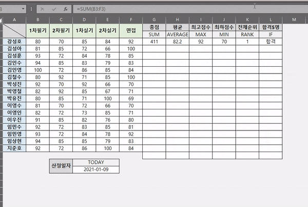 1번 응시자 1차필기시험 에서 부터 최종 면접시험까지 전체 점수들을 SUM 함수를 이용 하여 더해보려고 해요.