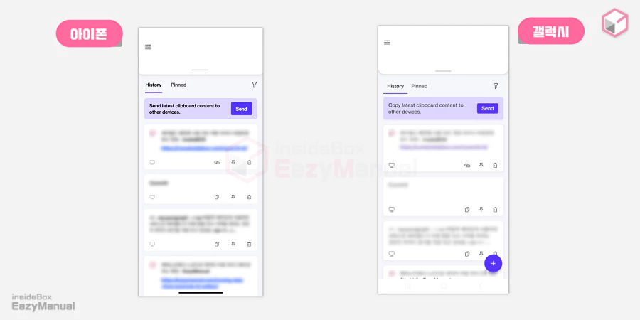 특정 기기에서 복사를 하게되면 클립 보드에 공유 되는데 이와 같이 연동 된 모든 기기의 History 탭에서 이력을 확인 가능 합니다.