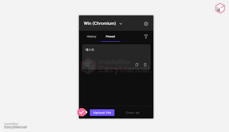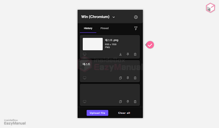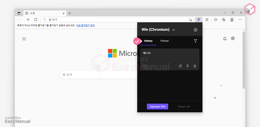 - 3 일반적인 클립 보드 와 마찬가지로 History 탭에서 확인 할 수 있습니다. 클립 보드 와 마찬가지로 Pin 으로 고정 해서 보관 해서 사용 도 가능 합니다.