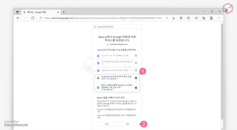 - 5 계정 정보 를 입력 하게 되면 엑세스 요청 화면이 보여지게 됩니다. 확인 후 계속 진행 하고싶다면 모두 체크 ( 1 ) 합니다.