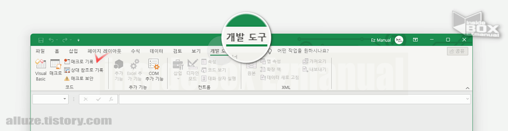 Office에서 매크로 메뉴 는 개발 도구 탭에서 확인 하 실 수 가 있습니다.