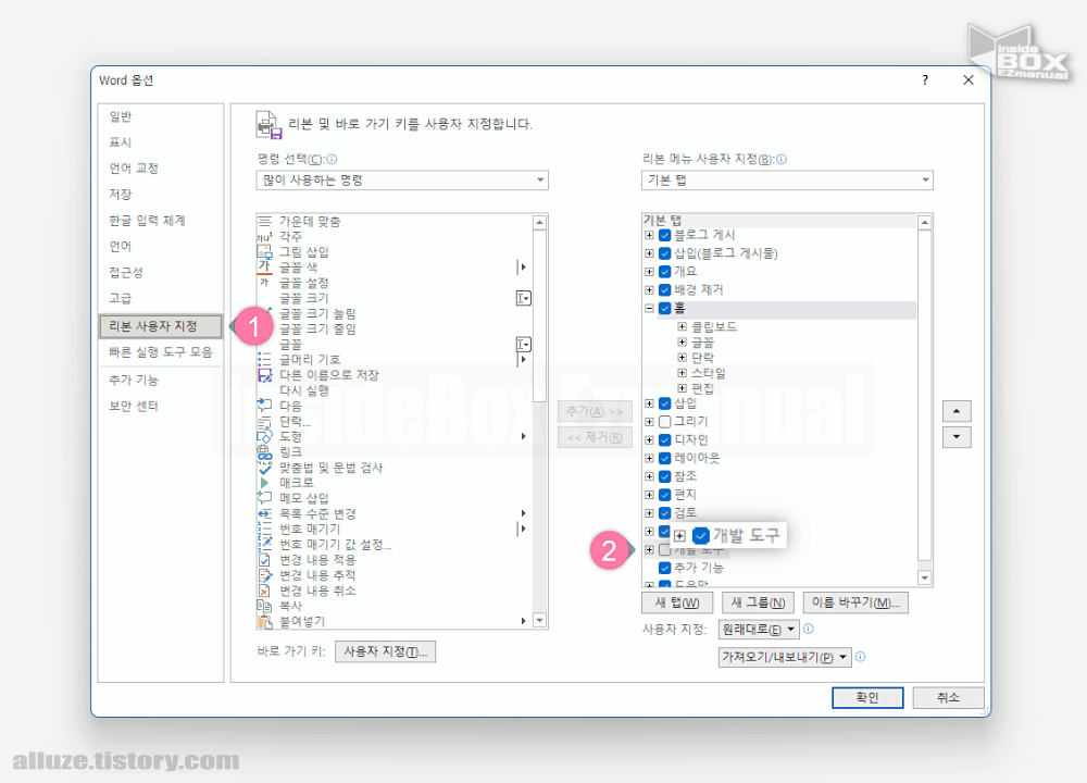 - 4 그 다음 오른 쪽 사용자 지정 항목에서 개발 도구 ( 2 )를 찾아 체크박스에 체크 를 해 주겠습니다.