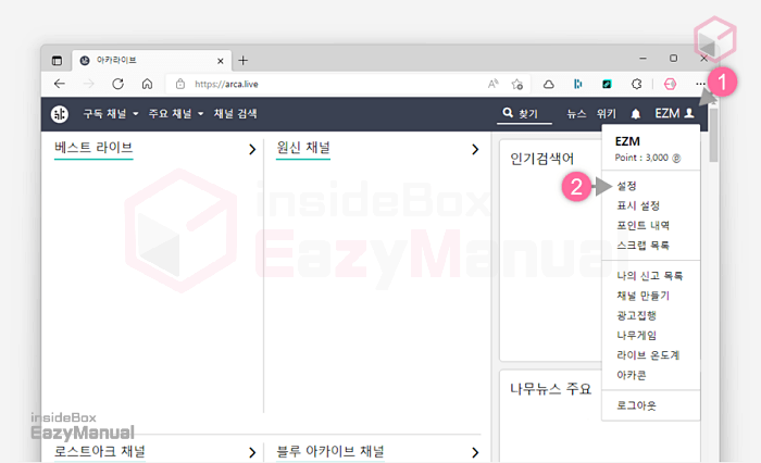 - 1 먼저 아카라이브 로그인 후 오른쪽 상단 프로필 ( 1 ) 을 클릭 해 항목 을 확장 해주겠습니다.