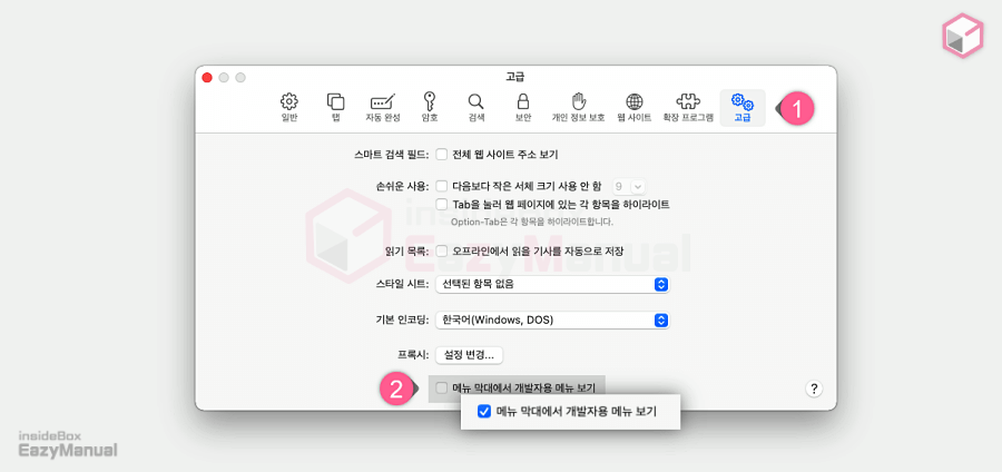 Safari 의 자체 설정 메뉴 를 통해서 개발자용 메뉴 를 활성화할수 가 있 습니다.