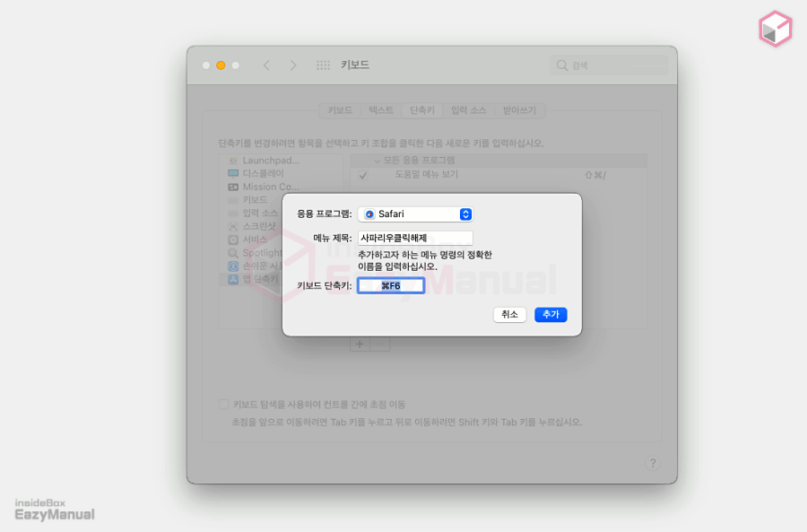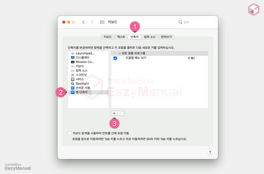 - 6 앱 단축키를 선택 한 상태에서 단축키를 등록하기 위해 + ( 3 ) 를 클릭 합니다.