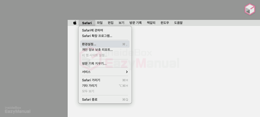 를 실행 한 상태에서 메뉴막대의 Safari 탭을 클릭 합니다. - 2 그 다음 확장된 메뉴 에 서 환경설정 을 클릭 해줍니다.