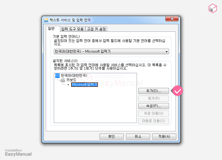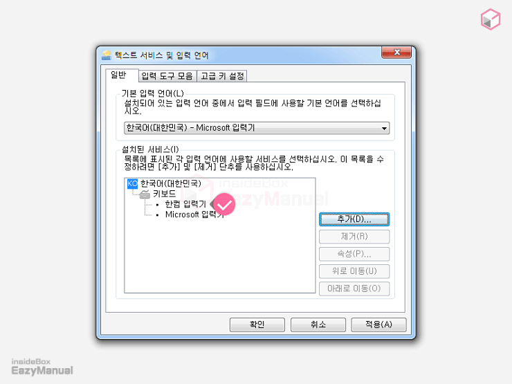 - 1 먼저 제어판을 통해서 다시 '텍스트 서비스 및 입력 언어' 창 을 열어 준 다음 추가(D) 단추를 클릭 해 주도록 하겠습니다.