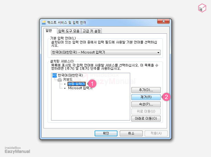 - 2 그 다음 설치된 서비스(I) 항목 에서 한국어 > 키보드 > 한컴 입력기 ( 1 ) 의 순서로 선택을 해주면 되겠습니다.