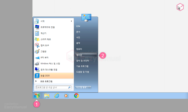 ( 1 ) 을 클릭 해 시작 항목 을 열어 주겠습니다. - 2 그 다음 제어판 ( 2 ) 으로 이동 해 주면 되겠습니다.
