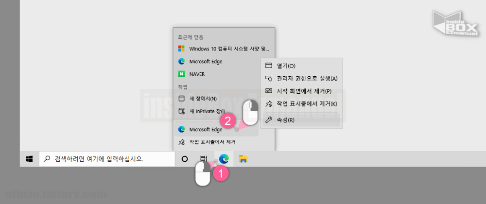 - 1 먼저 작업 표시줄에서 경로를 알고싶은 프로 그램 ( 1 ) 을 마우스 우측 버튼으로 클릭 해 주세요.