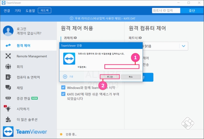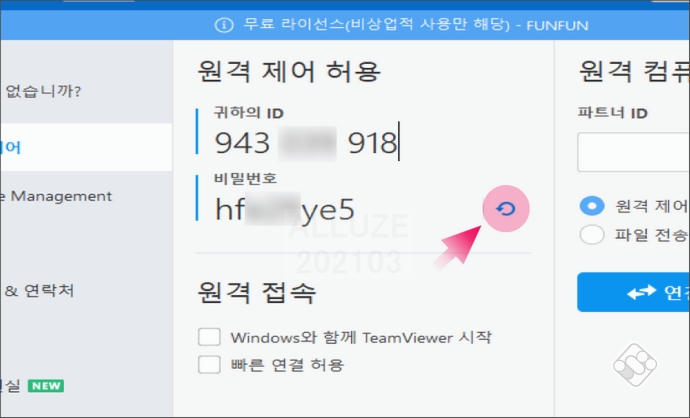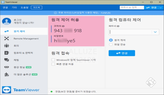 본인의 PC 전용 ID가 되는 숫자 입니다. 비밀번호 는 ID 로 접속 시 접속자가 입력해야하는 부분입니다. ID 를 알고 있더라도 비밀번호 를 모르면 접속이 안되는 것입니다.