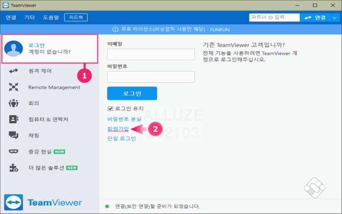팀뷰어 접속 프로그램의 로그인 메뉴 (①) 를 클릭해준 후 회원가입 (②)으로 진행 해줍니다.