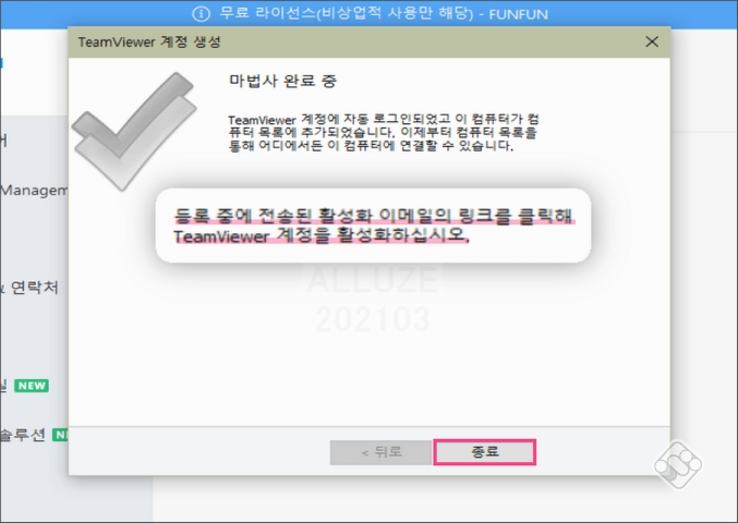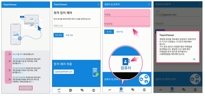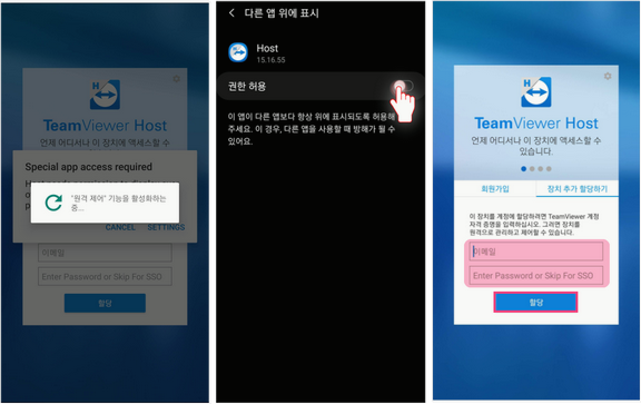 설치 후 위의 순서로 진행이 됩니다. 원격 제어 기능을 활성화 한 후 권한 허용 과 회원가입 해줍니다.
