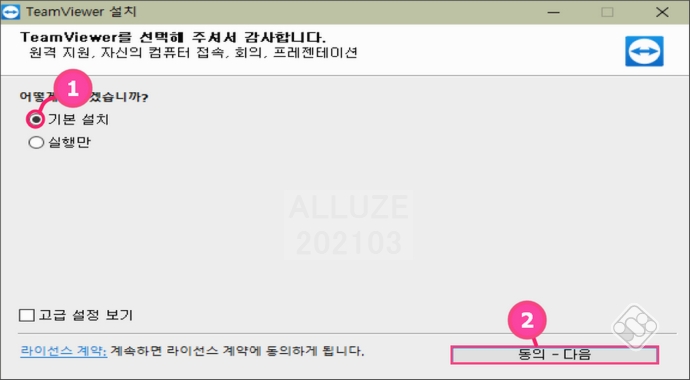 기본설치 (①) > 동의-다음 (②) 순서로 클릭해줍니다.