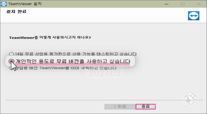 [개인적인 용도로 무료 버전을 사용하고 싶습니다.]를 선택해줍니다. 그리고 하단의 [종 료] 버튼을 클릭 해줍니다.