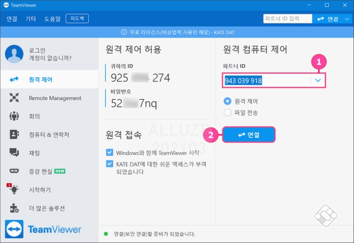 원격 제어 허용 이라는 부분을 확인 해줍니다. 귀하의 ID는 9자리 숫자로 표기 되어있습니다.