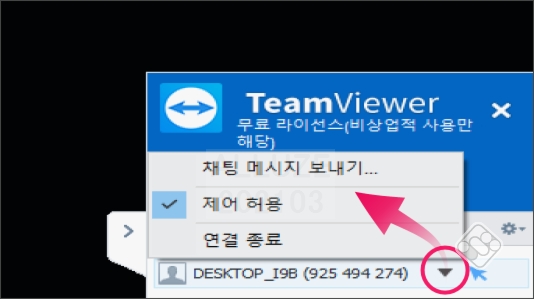 ▼ 이 아이콘을 누르면 채팅 메시지 보내기 와 제어 허용 / 연결 종료 등을 할 수 있습니다.