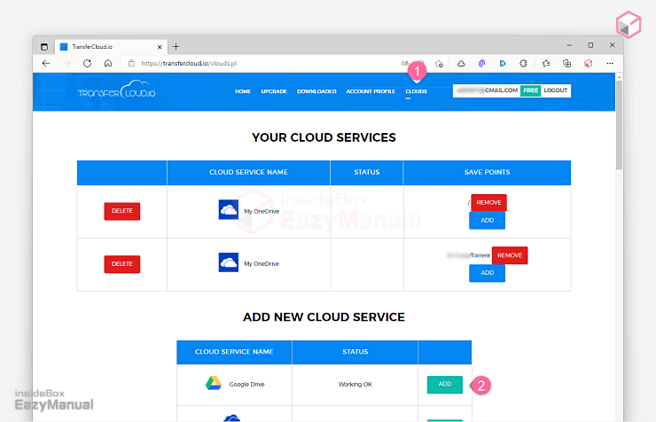 - 클라우드 등록은 아래 ADD NEW CLOUD SERVICE 항목 에서 ADD ( 2 ) 버튼으로 추가 할 수 있습 니다.